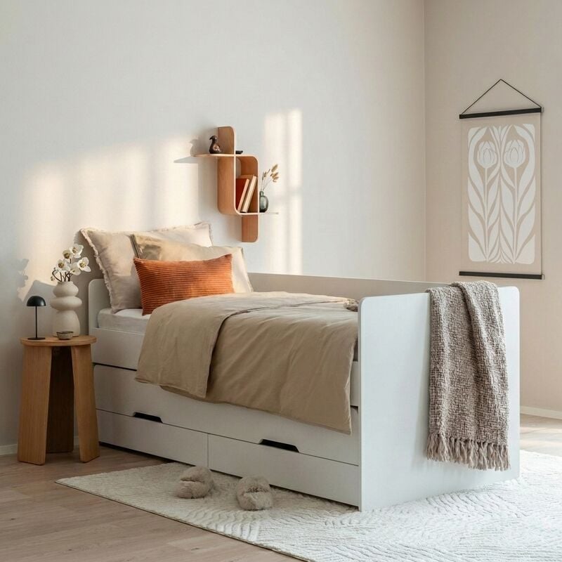 Selkeälinjainen muotoilu tekee sängystä helposti yhdisteltävän erilaisiin sisustuksiin. Se toimii hyvin niin lastenhuoneessa, nuoren omassa tilassa kuin vierashuoneessakin. Jemma auttaa pitämään tilan rauhallisena ja toimivana, vaikka neliöitä olisi vähemmän.