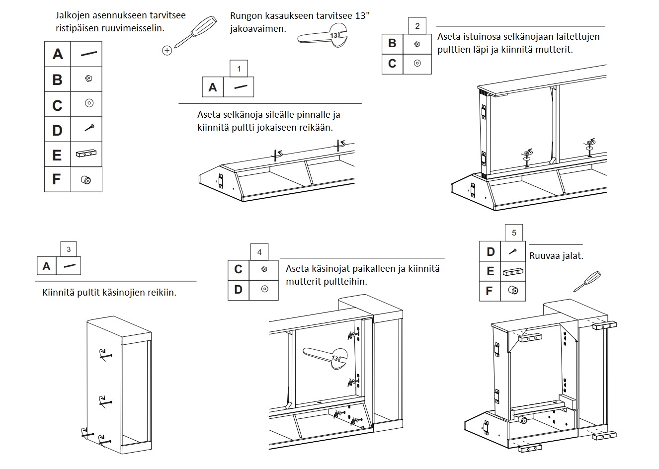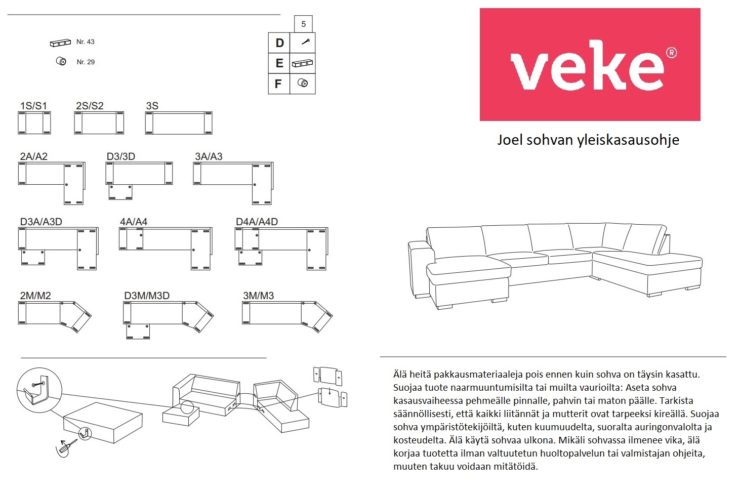 Istuintyynyt ovat kimmoisat, sisältönä niissä on laadukas ja kestävä HR-kylmävaahtotäyte 35 kg/m3 ja sen pinnalla polyesterivanutus 200 g/m2. Istuintyynyjen verhoilu on 1-puoleinen, alapuoli on verhoiltu apukankaalla. Selkätyynyt ovat puolipehmeät ja kimmoisat, sisältönä on pallokuitutäyte. Sohvan istuinsyvyys on miellyttävä istua. Runko on jämäkkä. Kantavat osat on valmistettu puusta ja vanerista, muilta osin kalustelveyä.