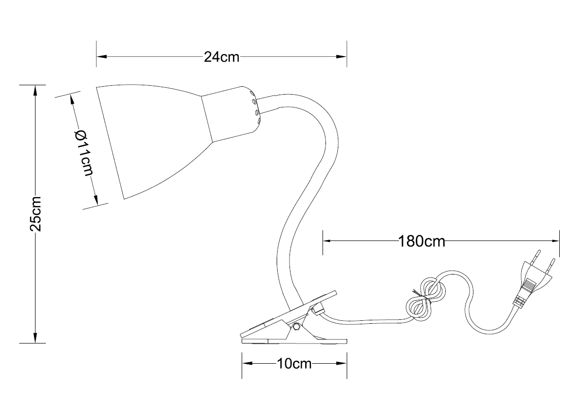 Joustavavartinen klipsivalaisin, jonka voi kiinnittää helposti hyllyn tai pöydän reunaan. Valo on helppo kohdistaa juuri oikeaan paikkaan. 180 cm johto tavallisella pistotulpalla. E27-kanta.
