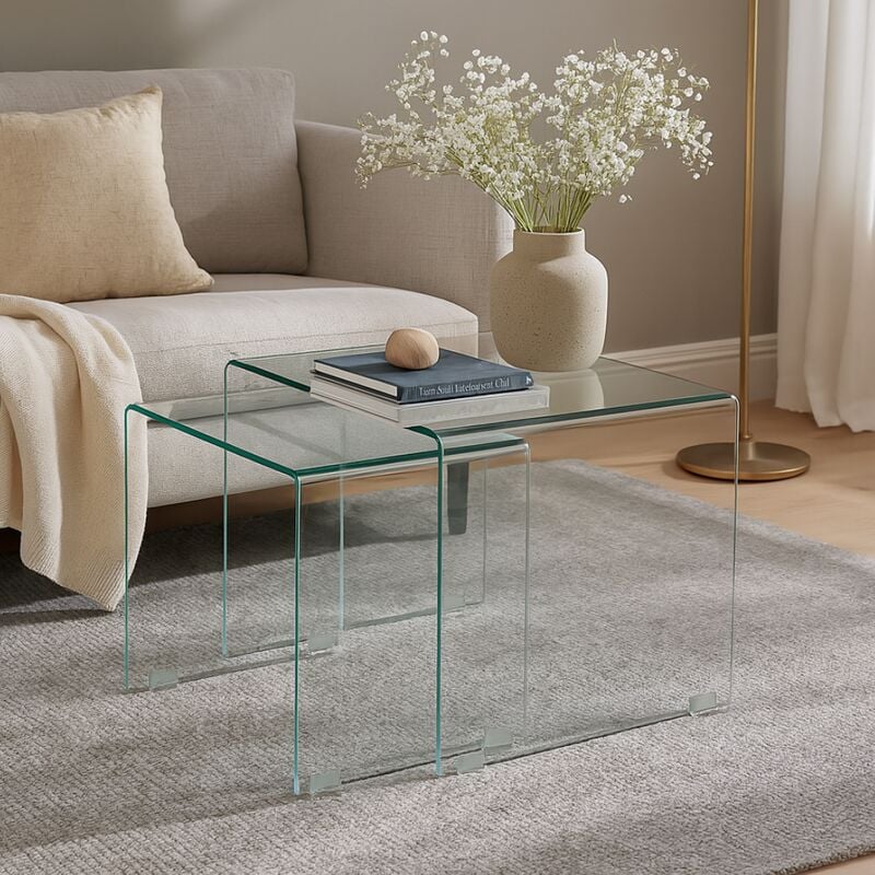 Kaksiosainen, lasinen sarjapöytä tuo keveyttä ja muunneltavuutta olohuoneeseen. Valmistettu karkaistusta 12 mm kirkaslasista. Jaloissa muoviset tallat.