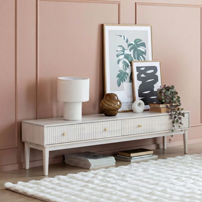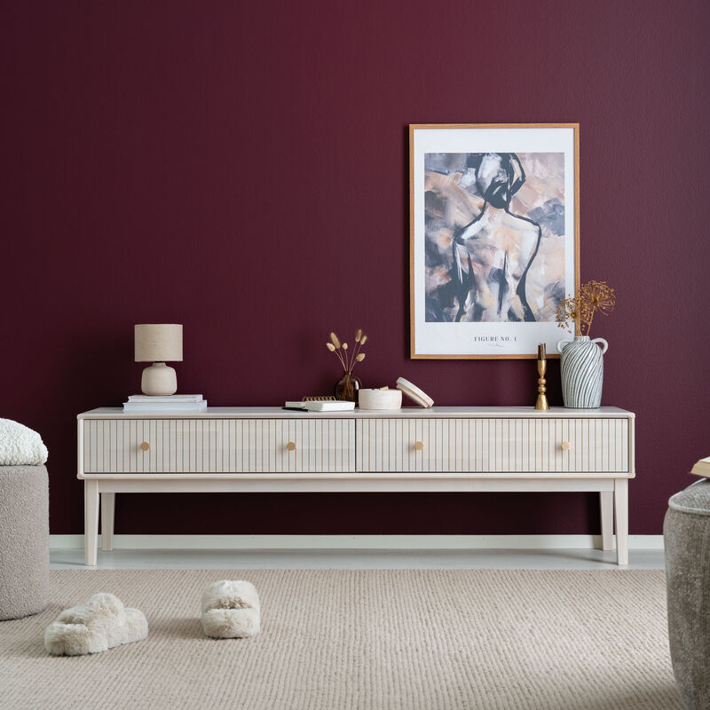 Kaksi suurta vetolaatikkoa antavat reilusti säilytystilaa kaikelle sille, mitä olohuoneessa kertyy: peliohjaimille, kaapeleille, leffoille, ohjekirjoille ja muulle pientavaralle, jonka haluat mieluummin piiloon kuin pöydälle. Laatikkojen pystysuuntaiset rimauurteet tuovat pintaan eloa ja persoonallisuutta ja kultaiset vetimet lisäävät sopivan ripauksen viimeisteltyä fiilistä. Tapio toimii tv-tasona yhtä hyvin, kuin matalana säilytystasona vaikka eteisessä tai makkarissa, kun kaipaat siistiä linjaa ja lisää järjestystä.