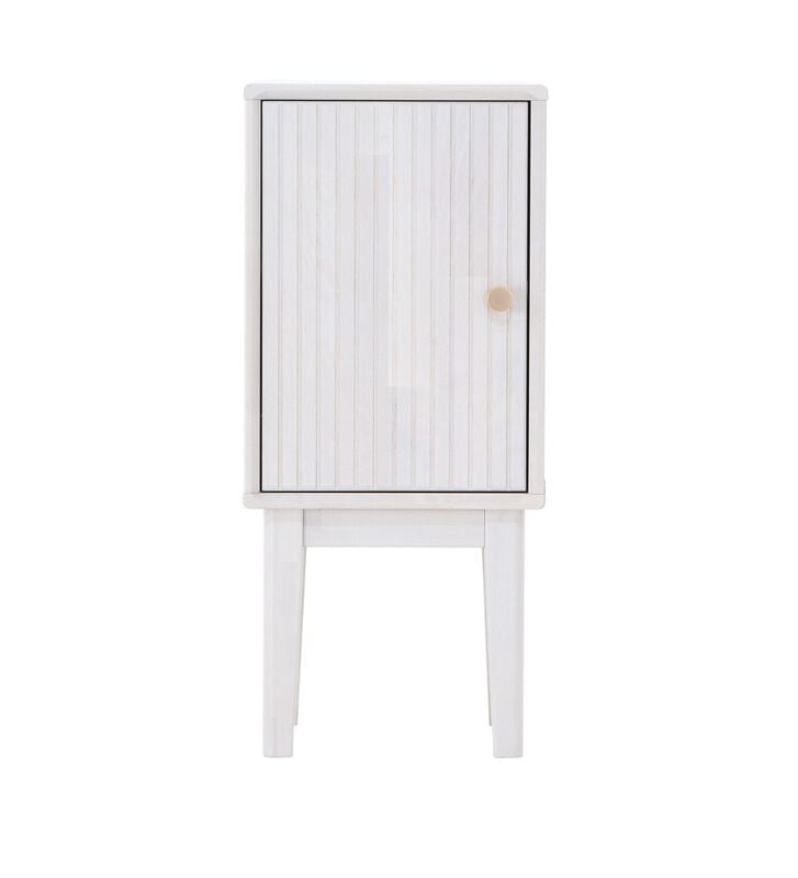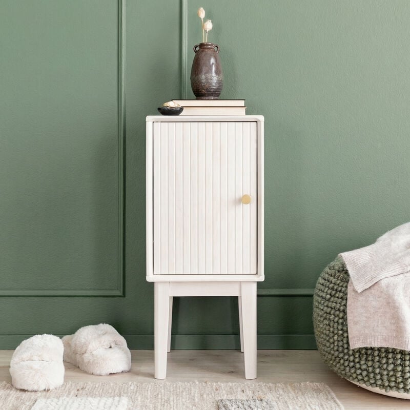 Kaapinoven taakse saat piiloon kaiken sen, mitä haluat pitää lähellä, mutta poissa näkyviltä: kirjat, lääkkeet, kuulokkeet, latausjohdot ja muut pienet arjen jutut. Ovien hidastesaranat tekevät sulkemisesta pehmeää ja hiljaista. Pystysuuntaiset rimauurteet antavat etupintaan kauniin rytmin ja kultainen nuppivedin tuo mukaan lämpimän yksityiskohdan, joka tekee yöpöydästä kiinnostavan, vaikka muu sisustus olisi pelkistetty.