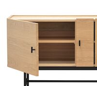 Tyylikäs Korte tv-taso mustilla metallijaloilla ja vetimillä. Upea aito tammiviilutettu pinta, jossa näkyy puun kuviointi.