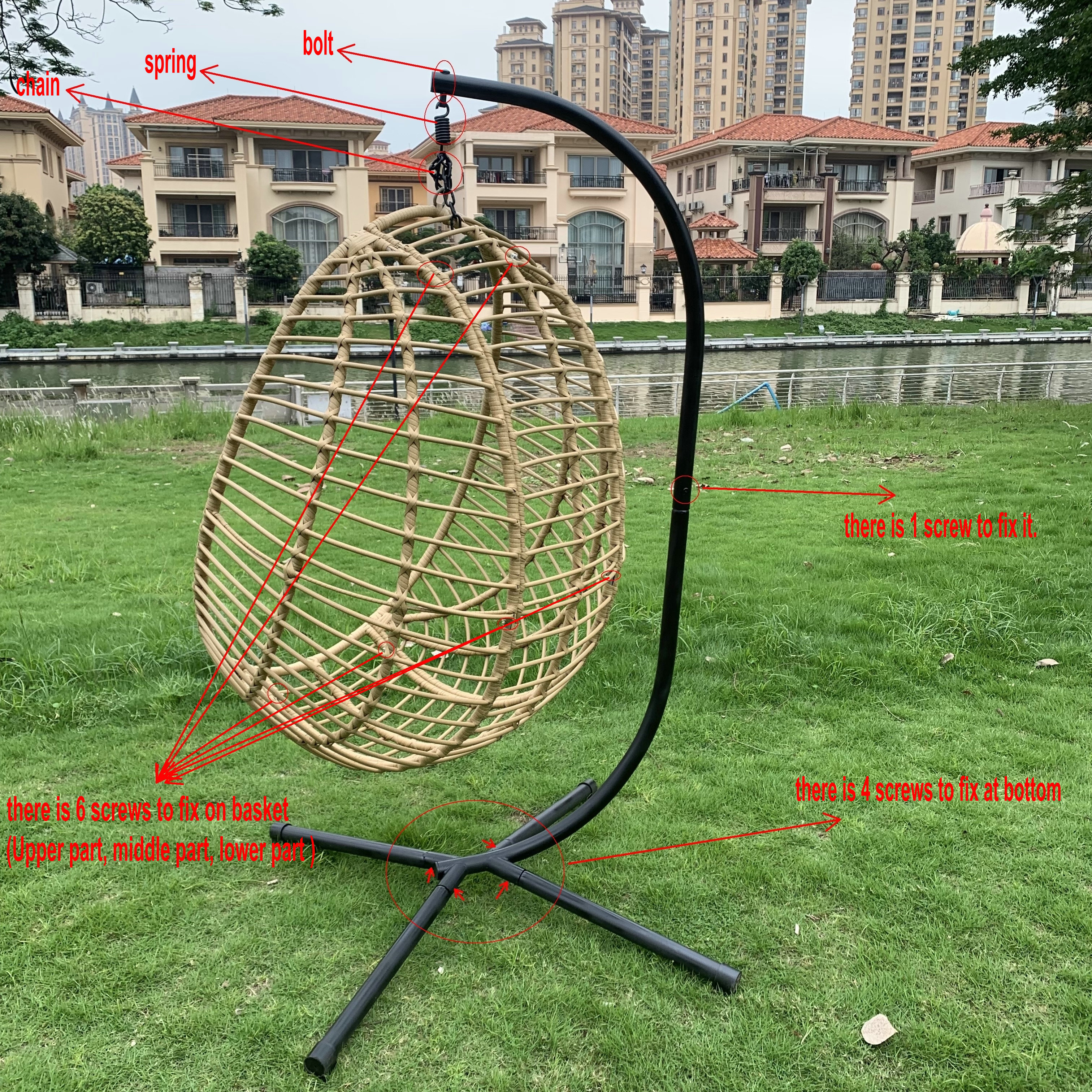 Tukeva musta teräsrunko ja luonnonvärinen polyrottinkipunos luovat ajattoman yhdistelmän. Riipputuoliin kuuluu muhkea hiekan värinen pehmuste sekä niskatyyny, joiden päälliset on helppo irrottaa ja pestä 30 asteessa. Päällinen on kestävää polyesteriä ja täytteenä on pehmeää polyesterivanua.