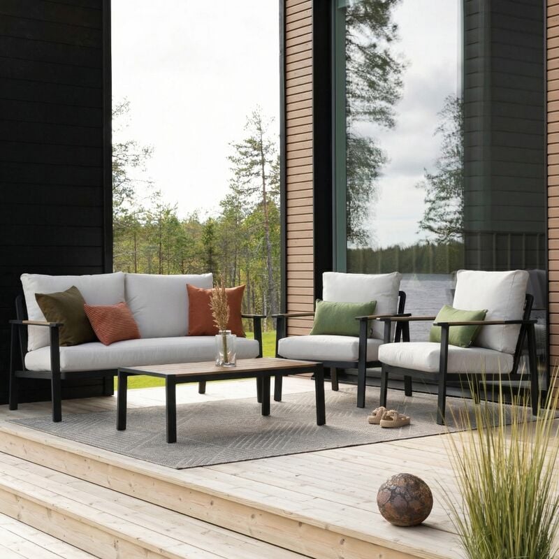 Moderni ja säänkestävä sohvaryhmä ulkokäyttöön. Alumiinirunko ei ruostu ja polywood-yksityiskohdat tuovat puumaisen ilmeen ilman huoltoa. Pehmeät pehmusteet suositellaan säilytettäväksi sateelta suojassa.
