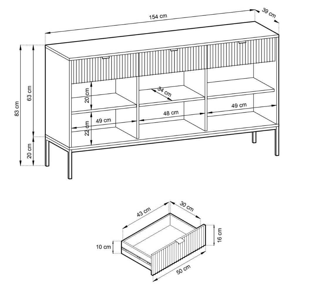 Tyylikäs Latte senkki 154x39x83 cmTyylikäs Latte senkki sisältää runsaasti säilytystilaa. Senkistä löytyy kolme vetolaatikkoa sekä kolme säilytyskaappia, joissa jokaisessa on välihylly. Senkin runko on 16 mm paksua laminoitua kalustelevyä, jossa on ABS-reunanauha. Mustat 20 cm korkeat metallijalat tuovat senkille siron yleisilmeen. Laatikoiden ja ovien etusarjat ovat 18 mm paksua mdf-levyä ja niissä on harjatut kullanväriset alumiinivetimet. Etusarjoissa olevat urat antavat senkille persoonallisen ilmeen, joka toistuu kaikissa tyylikkään Latte-tuotesarjan tuotteissa.