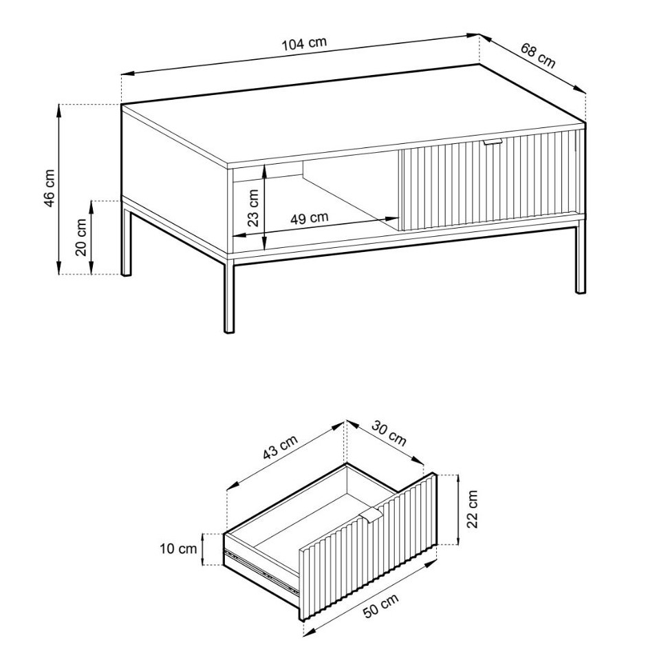 Käytännöllinen Latte sohvapöytä 104x68 cmTyylikäs ja siro Latte sohvapöytä, jossa on tilava vetolaatikko ja avohylly. Sohvapöydän runko on 16 mm paksua laminoitua kalustelevyä, jossa on ABS-reunanauha. Mustat jalat ovat metallia ja niiden korkeus on 20 cm. Laatikon etusarja on 18 mm paksua mdf-levyä ja siinä on harjattu kullanvärinen alumiinivedin. Etusarjassa olevat urat antavat sohvapöydälle kauniin ilmeen, joka toistuu kaikissa Latte-tuotesarjan tuotteissa.
