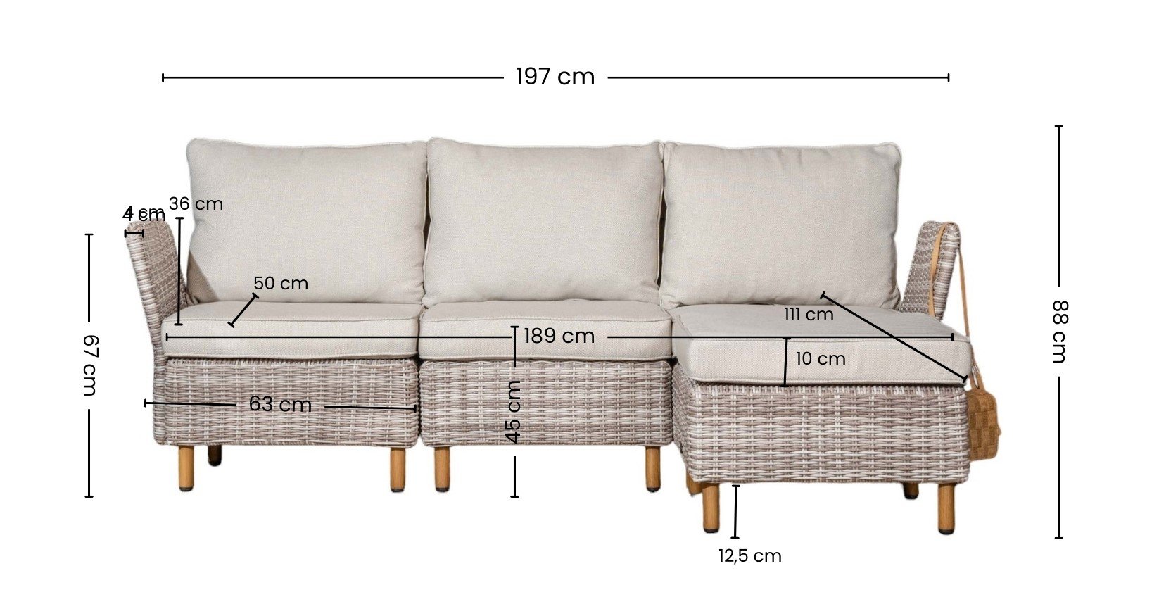 Polyrottinkinen divaanisohva raikkaan vaaleilla pehmusteilla. Pehmusteiden päälliset on vettä hylkivät, irroitettavat ja käsin pestävissä. Kätisyys helposti vaihdettavissa.