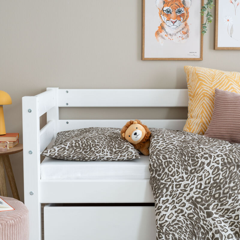Leopardi pussilakanasetti tuo lastenhuoneeseen trendikästä ilmettä ja pehmeää mukavuutta. Molemmin puolin painettu leopardikuvio tuo hauskaa vaihtelua, ja peitto on helppo pujottaa pussilakanan sisään kätevien käsiaukkojen ansiosta.