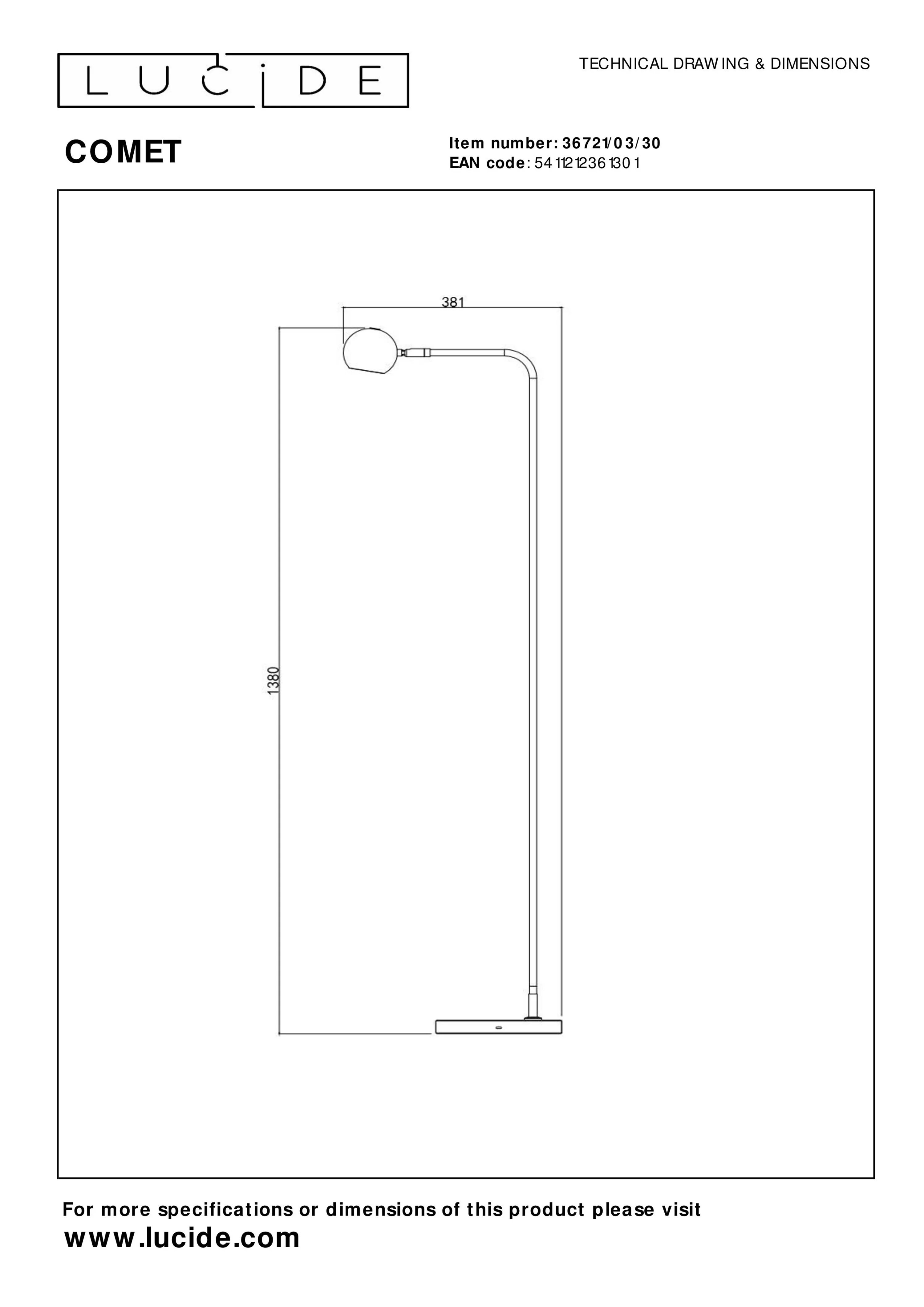 Moderni Lucide Comet ladattava lattiavalaisinLucide Comet on moderni ladattava lattiavalaisin, jonka siro olemus sopii saumattomasti erilaisiin koteihin ja sisustustyyleihin. Ladattava, laadukkaalla akulla varustettu lattiavalaisin on todella kätevä käyttää, sillä sen voi sijoittaa minne tahansa, missä valaistusta tarvitaan. Valaistuksen suuntaa voi säätää 90°. Valaisimessa on hipaisukytkin kuvussa, josta valaistustehoa voi säätää neliportaisesti. Himmennettävällä Comet lattiavalaisimella saat miellyttävän tunnelman mihin tahansa aktiviteettiin - olitpa lukemassa, opiskelemassa tai muuten vain viettämässä aikaa kotonasi.