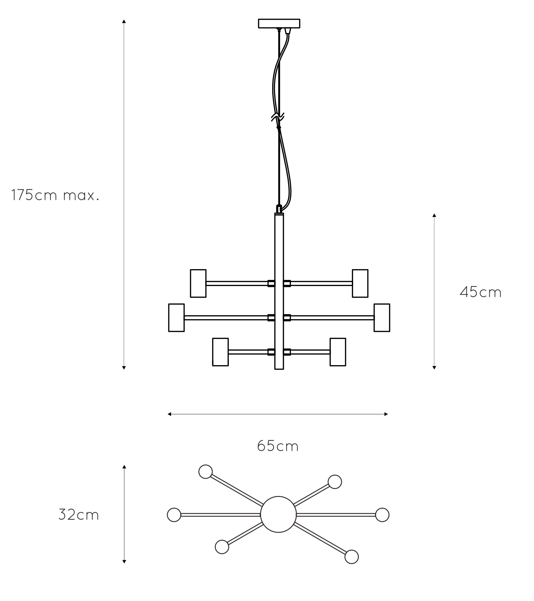 Laadukas Lucide Leanne riippuvalaisin 6-osainen mustaModerni musta Lucide Leanne riippuvalaisin olohuoneeseen ja ruokailutilaan. Yhdistä valaisimen kanssa koristeelliset ja näyttävät lamput. Kuvassa olevassa valaisimessa on koristeelliset, isot lamput. Lamput eivät sisälly hintaan. Valaisin kiinnitetään kattoon metallilevyn ja ruuvien avulla. Korkeus on säädettävissä asennusvaiheessa 100-175 cm välille. Polttimoiden vähimmäisetäisyys 50cm palaviin esineisiin tai kattoon.