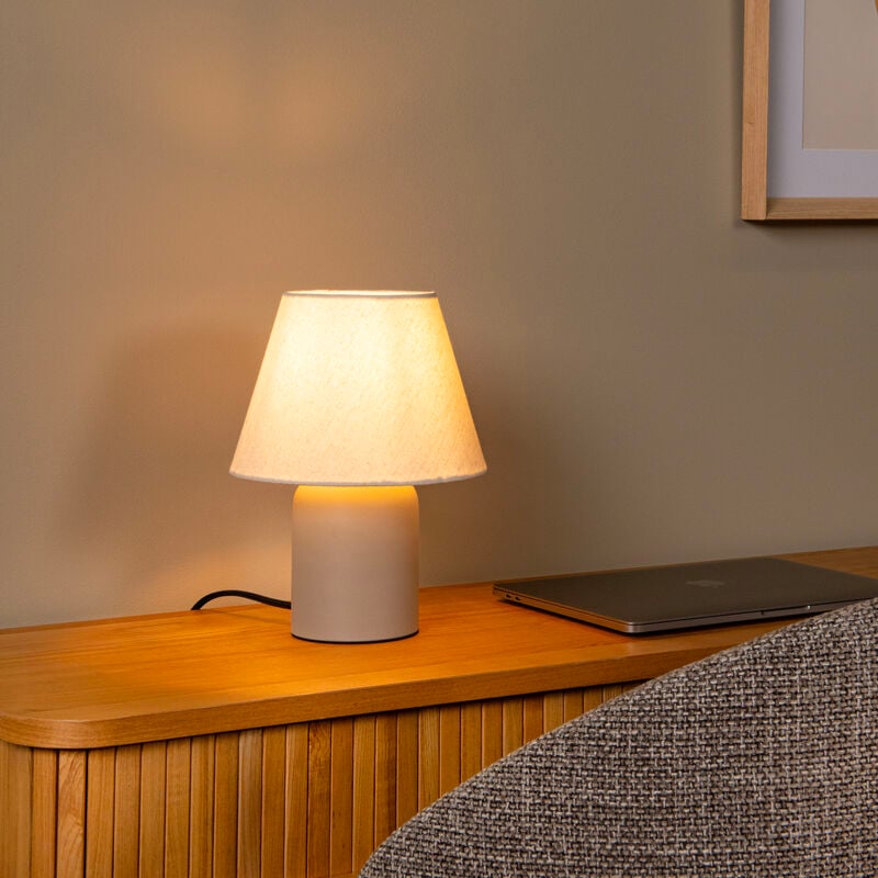 Ajattoman tyylikäs pöytävalaisin, jossa on keramiikkajalka ja luonnonvärinen tekstiilivarjostin. Sopii täydellisesti yöpöydälle, sivupöydälle tai työpisteeseen tuomaan pehmeää tunnelmavaloa.
