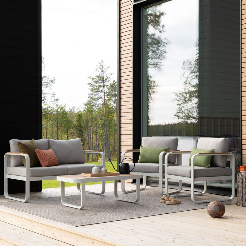 Lumme-sohvaryhmä tuo katettuun ulkotilaan modernia tyyliä ja huolettomuutta. Huoltovapaa alumiinirunko, aintwood-puukomposiittipinnat ja mukavat, ulkokäyttöön suunnitellut pehmusteet tekevät kokonaisuudesta helpon ja viihtyisän.