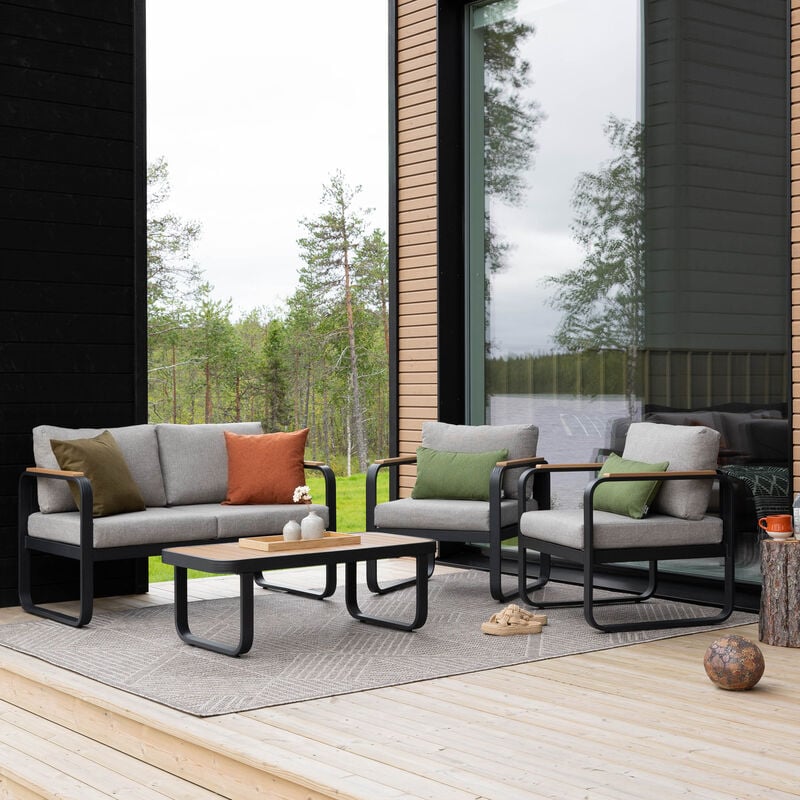 Lumme-sohvaryhmä tuo katettuun ulkotilaan modernia tyyliä ja huolettomuutta. Huoltovapaa alumiinirunko, aintwood-puukomposiittipinnat ja mukavat, ulkokäyttöön suunnitellut pehmusteet tekevät kokonaisuudesta helpon ja viihtyisän.