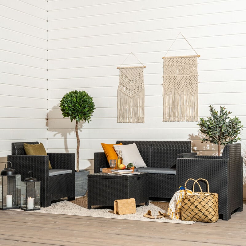 Terassille Lupiini sohvaryhmäTyylikäs, helppohoitoinen ja kestävä sohvaryhmäkokonaisuus ulkotilojen oleskeluun. Setti sisältää kaksi nojatuolia, sohvan ja sohvapöydän. Kauniisti muotoillut ergonomiset selkänojat ja istuintyynyt. Materiaalina helppohoitoinen polypropeeni, jossa on rottinkikuvio. Polypropeeni on kevyt, kestävä, UV-säteilyn ja säänkestävä materiaali. Pehmusteiden päälliset ovat vettähylkivää polyesteri-kangasta. Päälliset hylkii hiukan vettä, mutta ne eivät ole vedenpitävät. Pehmusteet tulee säilyttää sateelta suojassa.