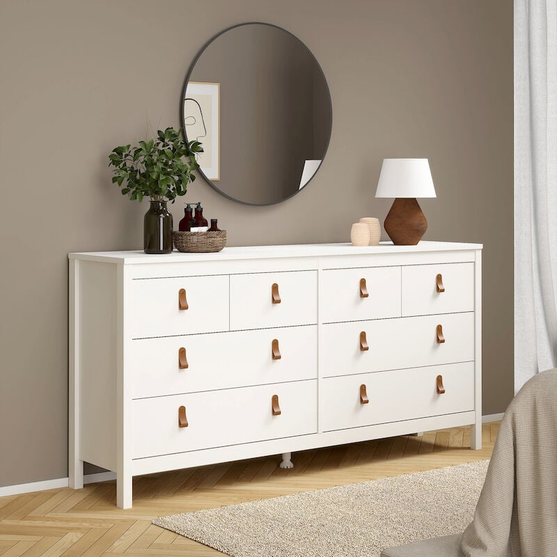 Tyylikäs iso Madrid lipastoMadrid 4+4 lipastossa on yhteensä 8 laatikkoa, 4 isoa ja 4 pienempää, joissa on kauniit vaihdettavat vetimet. Lipasto on omiaan lastenvaatteille, liinavaatteille, eteiseen ja kaikkiin muihinkin kodin kuiviin tiloihin. Kannen päälle jää runsaasti tilaa kauniille sisustusesineille. Laatikot tulevat 21,7 cm ulos ja mittatiedoissa on ilmoitettu vetolaatikoiden sisämitat. Säilytystilan mitoissa on isompien laatikoiden sisämitat ja vetolaatikkojen mitoissa pienempien sisämitat.