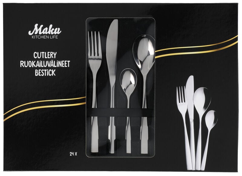 Klassiset Maku aterimet 24-osainenMaku ruokailuvälinepakkauksessa on 24 kpl aterinta. Aterimet ovat korkealaatuista kiiltävää ruostumatonta terästä. Lahjapakkaukseen kuuluu 6 veistä, 6 haarukkaa, 6 ruokalusikkaa ja 6 kahvilusikkaa. Täydellinen valinta esimerkiksi ylioppilaslahjaksi, lahjaksi valmistuneelle tai yksin muuttavalle. Aterimet voi pestä tiskikoneessa.