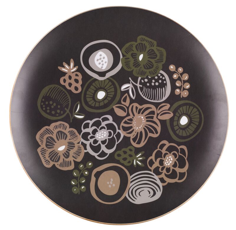 Kaunis vanerista valmistettu tarjotin, jossa on luonnonläheinen kukkakuviointi. Sopii kuivien elintarvikkeiden tarjoiluun ja toimii myös sisustuksen katseenvangitsijana. Käsinpesu, kuivattava pesun jälkeen.