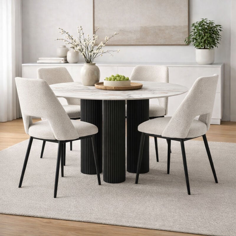 Manson–Alfon 4 hengen ruokailuryhmä yhdistää marmorikuvioidun kivikantisen pöydän ja pehmeälinjaiset verhoillut tuolit. Pyöreä muoto, veistokselliset mustat jalat ja hiekan sävyt luovat modernin ja kutsuvan kokonaisuuden.