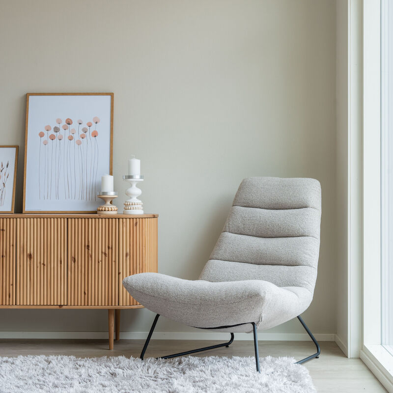 Ihastuttava buklee-kangaverhoiltu nojatuoli houkuttelee rentoutumaan.
