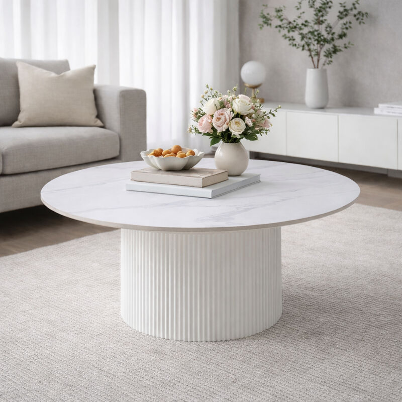 Pyöreä sohvapöytä Ø80 cm sintratulla kivikannella. Kestävä, helppohoitoinen ja marmorimaisesti kuvioitu kansi. Uritettu mdf-keskijalka on tukeva ja näyttävä. Korkeus 36 cm, jalan Ø40 cm.