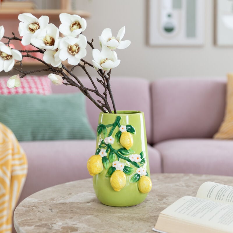Raikas keraaminen vaasi, jossa on kohokuvioidut sitruunat ja kukat. Piristää keittiön, olohuoneen tai parvekkeen somistusta. Mitat 26 x 23,5 x 23,5 cm. Sopii tuoreille ja kuivakukille.