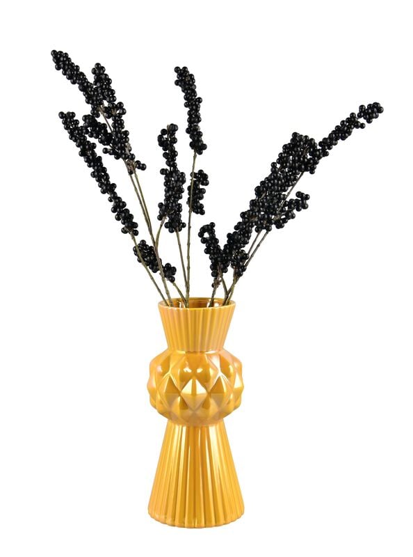 Keraaminen M&M Nupu vaasi keltaisena. Leveys 13 cm, syvyys 13 cm, korkeus 28,5 cm. Veistoksellinen muoto tuo pöydälle tai ikkunalaudalle pirteän katseenkiinnittäjän. Sopii kauniisti yksittäisille oksille ja kuivakukille.
