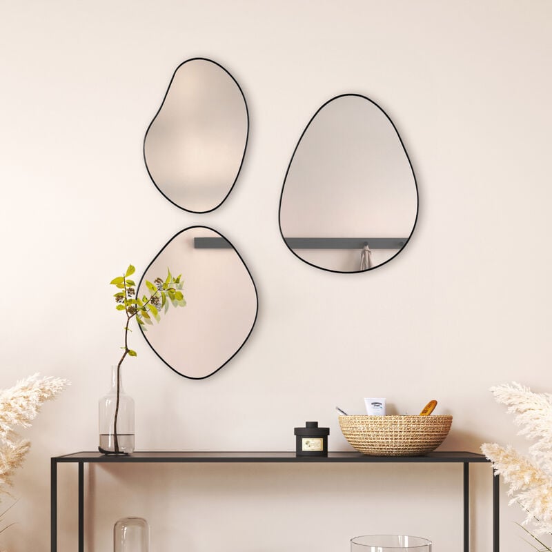 Kolmen peilin setti orgaanisilla muodoilla. Ohut metallikehys tuo keveyttä ja viimeistelee seinäpinnan. Ripustat pystyyn tai vaakaan; ripustimet ovat valmiina. Yhdistä ryhmäksi tai käytä erikseen.