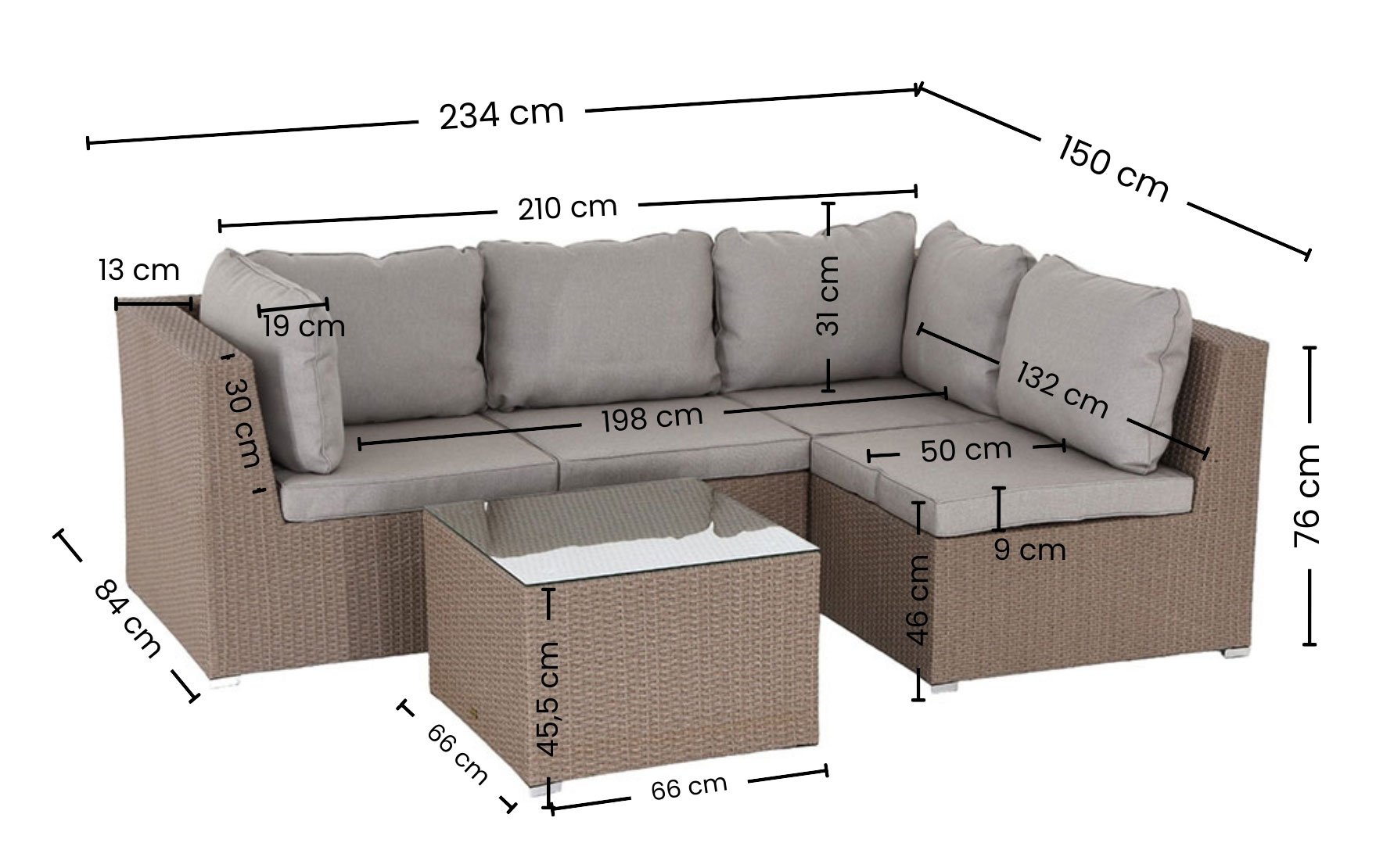Sohva on valmistettu kestävästä, kauniin sävyisestä polyrottingista ja säänkestävästä alumiinista, mikä tekee siitä kevyen ja helpon siirrellä. Alumiinirunko ei ruostu sateessa, joten sohva kestää hyvin vaihtuvissa sääolosuhteissa. Sohvapöydässä on lasikansi, joka on helppo puhdistaa ja se kestää hyvin ulkokäytössä.