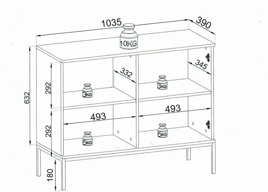 Senkin runko on 16 mm paksua laminoitua kalustelevyä ja siinä on ABS-reunanauha. Tyylikkään uritetun oven etusarja on 18 mm paksua mdf-levyä ja lasiovi on 4 mm paksua karkaistua savulasia, jonka ympärillä on alumiinikehys. Ovissa on push-to-open -mekanismi (Titus) sekä Häfelen saranat. Jalat ovat pulverimaalattua metallia ja niiden korkeus on 18 cm.