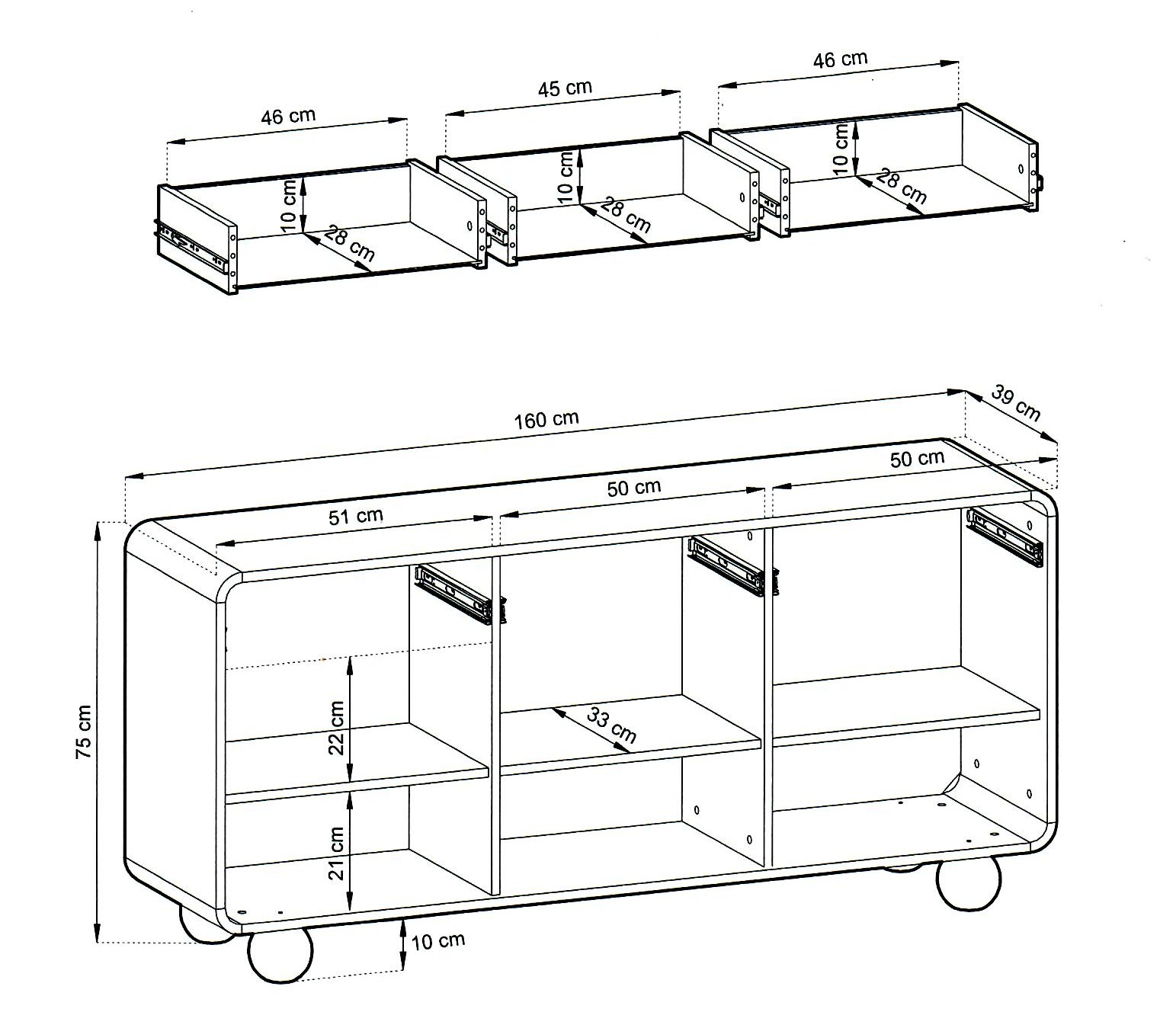 Kashmirin sävyinen runko on valmistettu 16 mm laminoidusta kalustelevystä, joka on viimeistelty ABS-reunanauhalla ja kaarevilla mdf-listoilla. Senkissä on kolme laatikkoa ja kolme kaappia, joissa jokaisessa on välihylly eli runsaasti tilaa niin astioille, liinavaatteille kuin arjen pientavaralle.