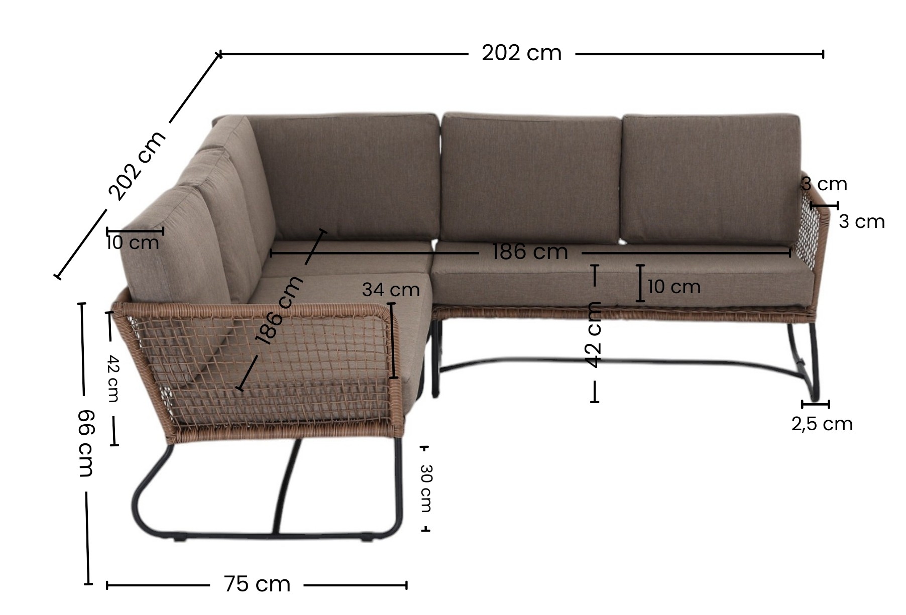 Laadukas Silmu kulmasohva 2K2Laadukkaalla Silmu kulmasohvalla on mukava nauttia kesäpäivistä ja syksyn hämyisistä illoista. Sohvan tukeva mustaksi pulverimaalattu alumiinirunko kestää erinomaisesti säätä ja on täysin huoltovapaa. Tyylikäs 5 mm:n polyrottinkipunos antaa sohvalle luonnollisen ilmeen ja tekee siitä kestävän valinnan ulkokäyttöön.