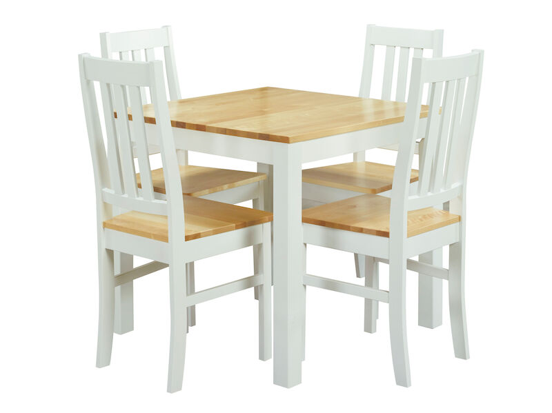 Tyylikäs koivusta valmistettu pieni 4-hengen ruokailuryhmä, poikkeuksena valkoinen väri. Pöydän koko 80x80 cm johon mahtuu 4 tuolia.