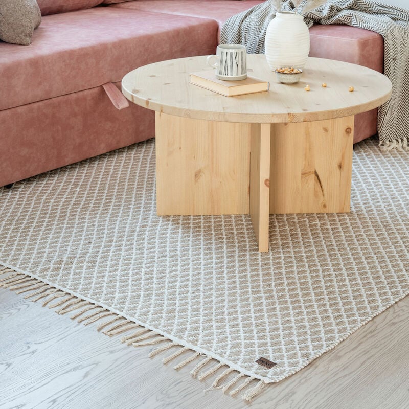 Monikäyttöinen Neva puuvillamattoKäsinkudotussa Neva puuvillamatossa on kiva ruutukuvio ja päissä hapsut. Materiaali on puoliksi puuvillaa ja puoliksi juuttia. Monikäyttöinen matto soveltuu hyvin niin keittiöön ja kodinhoitohuoneeseen kuin takka- tai olohuoneeseen.