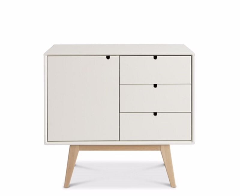 Kotimainen, Kiteen Huonekalutehtaalla valmistettu Notte lipasto. Materiaalina massiivikoivu, väreinä koivu ja valkoiseksi maalattu, jossa koivun väriset jalat.