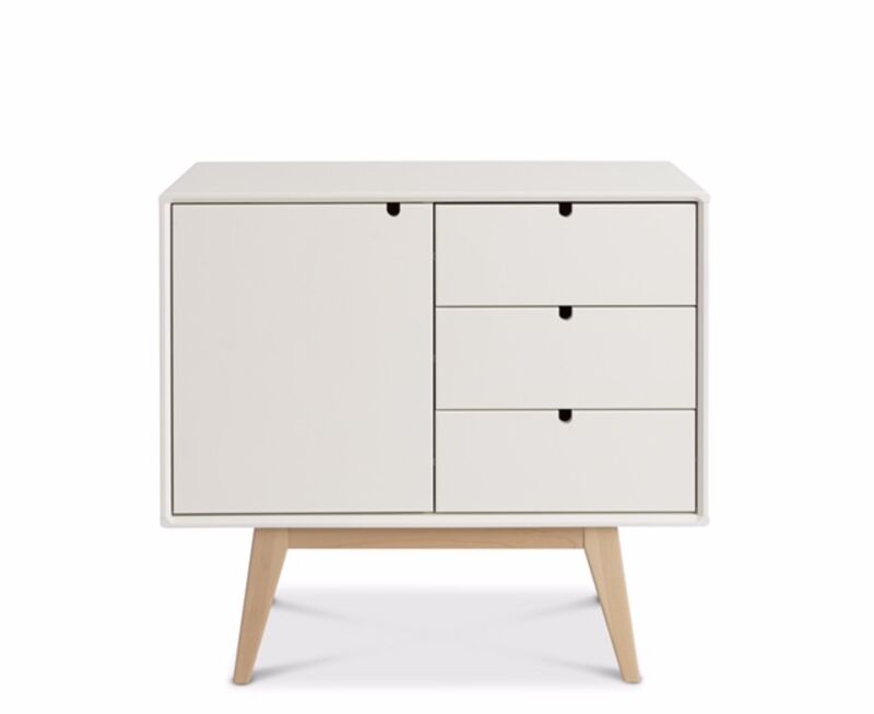 Kotimainen, Kiteen Huonekalutehtaalla valmistettu Notte lipasto. Materiaalina massiivikoivu, väreinä koivu ja valkoiseksi maalattu, jossa koivun väriset jalat.