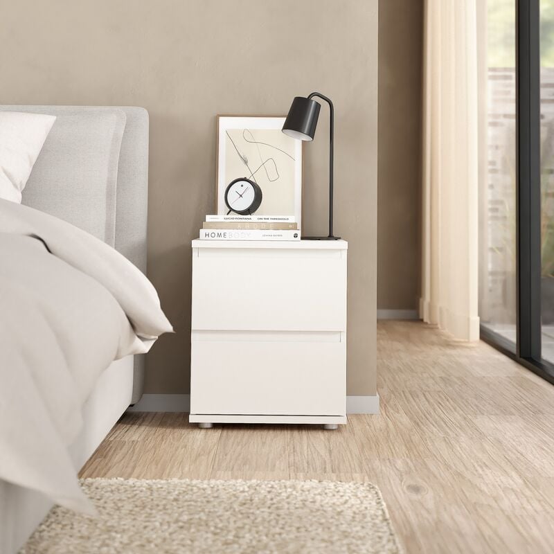 Selkeälinjainen Nova yöpöytäNova yöpöytä on helppo valinta, kun haluat makuuhuoneeseen ajattoman ja siistin kokonaisuuden. Selkeä muotoilu sopii monenlaisiin tyyleihin ja tuo sängyn viereen käytännöllistä, selkeää säilytystilaa. Kahteen laatikkoon saat talteen kirjat, laturit, kuulokkeet ja muut iltatarvikkeet. Kun tavarat sujahtavat laatikoihin, tasolle jää rauhallinen tila valaisimelle, kellolle ja vesilasille. Pehmeästi liukuvat kuulalaakerikiskot tekevät laatikoiden avaamisesta ja sulkemisesta sujuvaa.