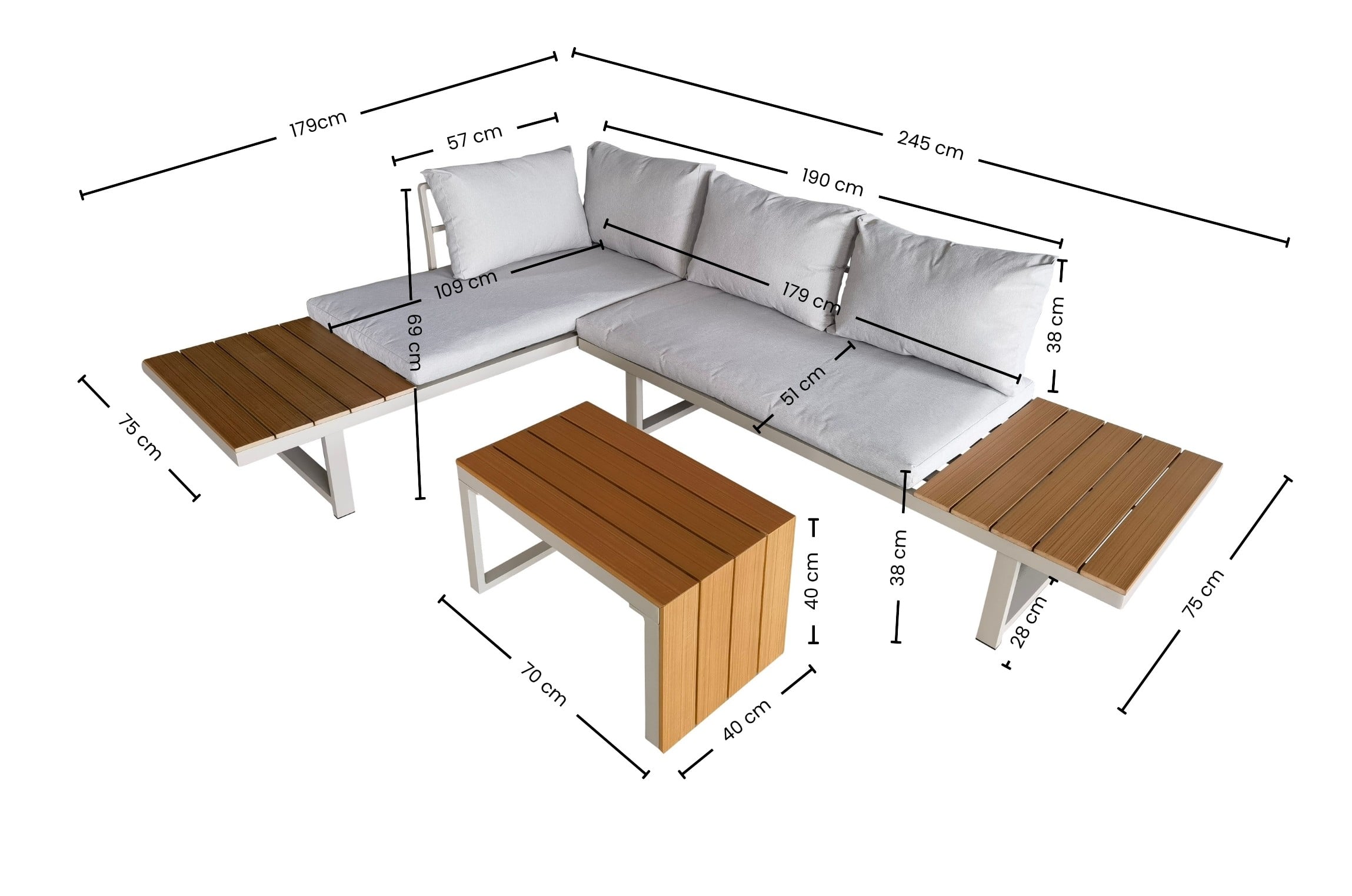 Monipuolinen ja edullinen ulkosohvaryhmä, jossa kevytrakenteinen alumiinirunko ja aintwood-pinnat. Muunneltavat moduulit ja kompakti pöytä tekevät tästä täydellisen valinnan niin isolle terassille kuin pienemmälle parvekkeellekin.