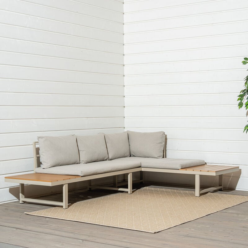 Mukana tuleva kompakti pöytä (70x40 cm) toimii näppäränä laskutasona kahvikupille tai kesäisille tarjoiluille. Pöytää voi käyttää niin pystyssä kuin vaakassa, riippuen kuinka sohvan moduulit on aseteltu. Pehmeät istuintyynyt tuovat lisämukavuutta oleskeluun ja greigen sävyinen kokonaisuus sulautuu helposti monenlaiseen pihasisustukseen.