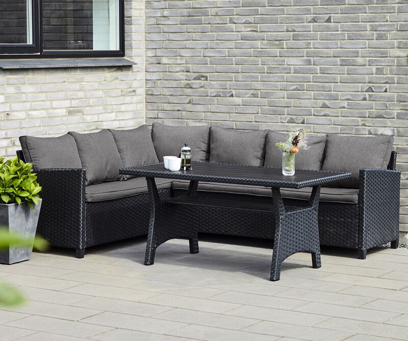 Tee ulkotiloistasi viihtyisä oleskelukeidas käytännöllisellä sohvaryhmällä, joka sisältää kulmasohvan sekä pöydän. Sohvan kätisyyden voi valita kasauksen yhteydessä, joten se mukautuu helposti eri tiloihin.