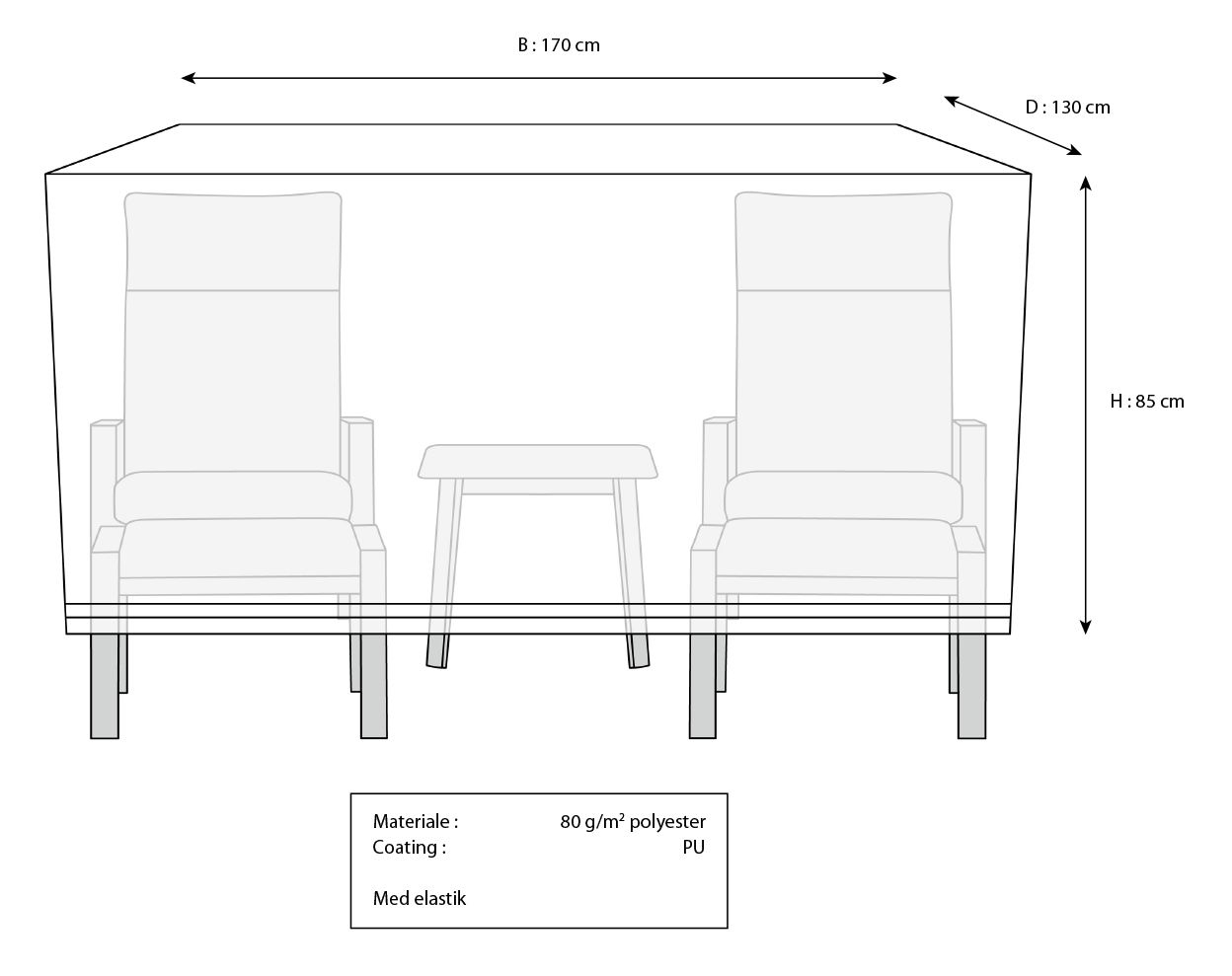 Vahva polyesterikangas PU-pinnoitteella pitää kalusteet kuivina ja suojassa. Lisäksi peitteessä on alhaalla joustava kuminauha, joka tekee sen asettamisesta paikoilleen vaivatonta. Kun un aurinko taas paistaa, UV-suojattu kangas varmistaa, että suojapeite ja kalusteet säilyttävät värinsä ja rakenteensa hyvänä pitkään.