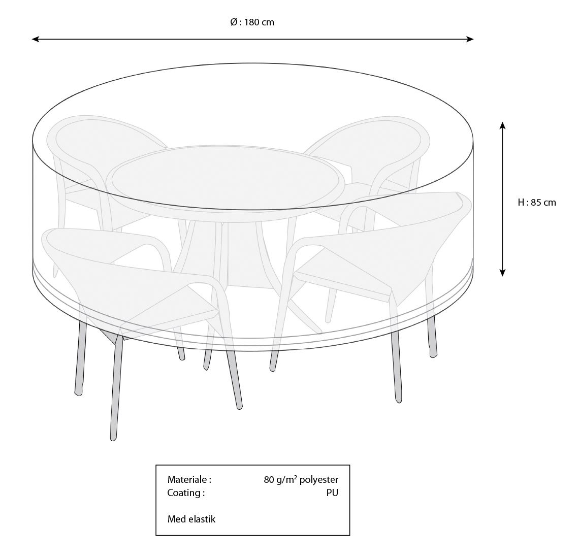 Vahva polyesterikangas PU-pinnoitteella pitää kalusteet kuivina ja suojassa. Lisäksi peitteessä on alhaalla joustava kuminauha, joka tekee sen asettamisesta paikoilleen vaivatonta. Kun aurinko taas paistaa, UV-suojattu kangas varmistaa, että suojapeite ja kalusteet säilyttävät värinsä ja rakenteensa hyvänä pitkään.