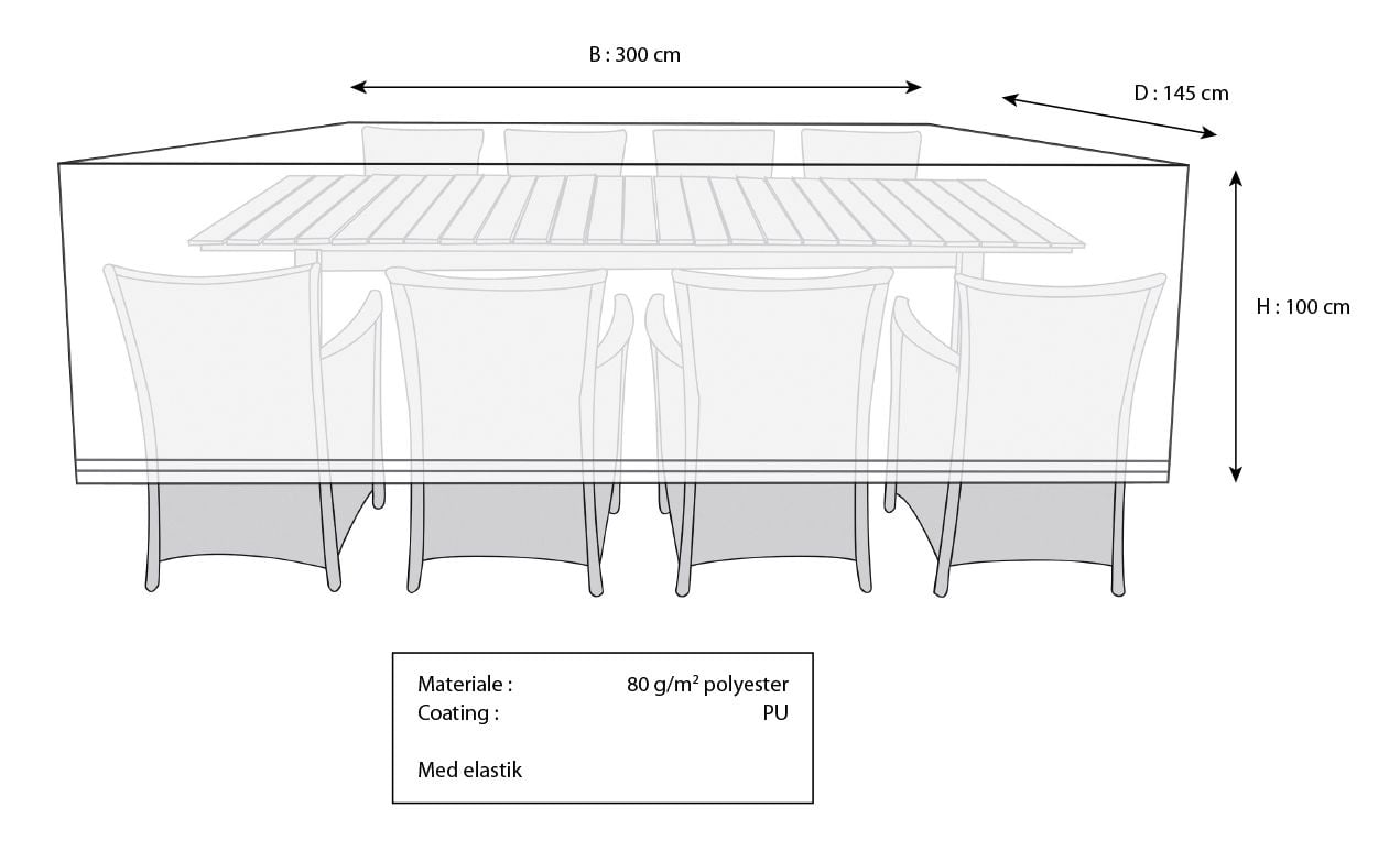 Vahva polyesterikangas PU-pinnoitteella pitää kalusteet kuivina ja suojassa. Lisäksi peitteessä on alhaalla joustava kuminauha, joka tekee sen asettamisesta paikoilleen vaivatonta. Kun aurinko taas paistaa, UV-suojattu kangas varmistaa, että suojapeite ja kalusteet säilyttävät värinsä ja rakenteensa hyvänä pitkään.