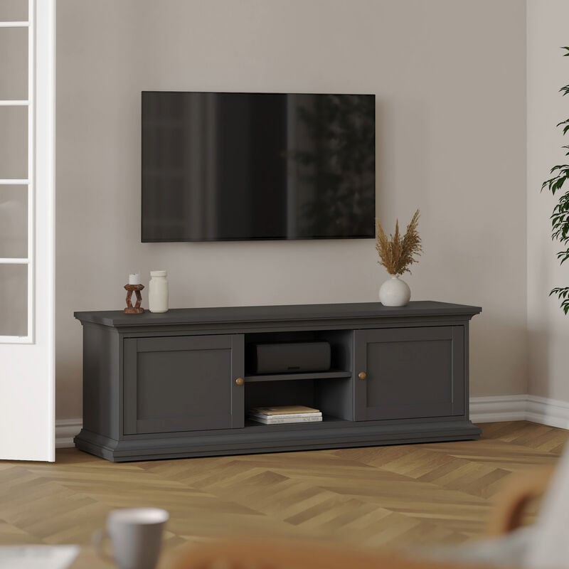 Paris tv-taso 150 tuo olohuoneeseen hienostunutta, klassista tunnelmaa. Koristeelliset listat alaosassa ja metalliset nuppivetimet luovat romanttisen ilmeen, joka on helppo yhdistää niin vaaleisiin kuin tummempiin sävyihin. Liukuovet kulkevat kevyesti kiskoilla ja piilottavat sisäänsä arvokasta säilytystilaa, kun taas avohylly keskellä tarjoaa paikan medialaitteille tai kauniille asetelmille.