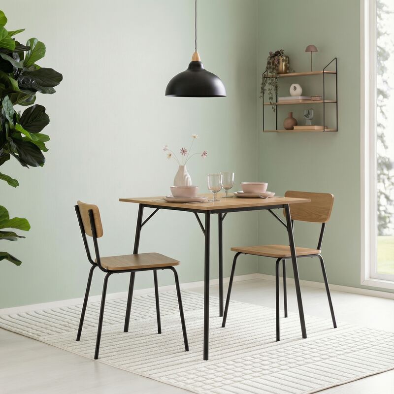 Ruokailuryhmän siro koko tekee siitä ihanteellisen valinnan pienempiin tiloihin. Vaikka se on kompakti, se tarjoaa käytännöllisen ja viihtyisän ruokailutilan, jossa yhdistyvät mukavuus ja tyylikkyys. Sekä pöydän että tuolien mustaksi pulverimaalatut metallijalat tuovat modernin ja skandinaavisen ilmeen, joka sopii monenlaisiin sisustustyyleihin.