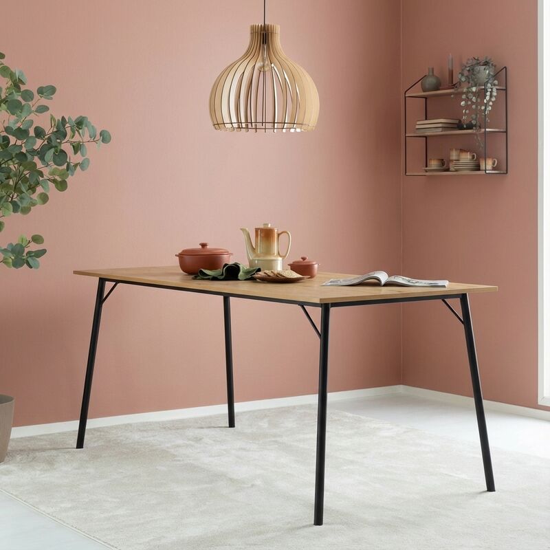 Sirokokoinen Peru ruokapöytä 170x80 cmSirokokoisessa Peru ruokapöydässä tammenvärinen melamiinipintainen pöydänkansi on kiinnitetty ohuille mustille metallijaloille. Yhdistelmä luo modernin ruokapöydän, jossa on ripaus maalaismaista vaikutelmaa. Pöydänkansi korostaa kauniisti puumaisen kuviointinsa, joka tuo esiin puunsyyt ja kuvioinnin selkeästi. Melamiinipintainen kansi on kuitenkin huoltovapaa ja helppo pitää puhtaana.