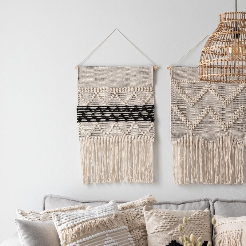 Poimu seinävaate kohokuvioilla ja hapsuilla. Seinävaatteen koko 50x70 cm. Materiaali 100% puuvilla.