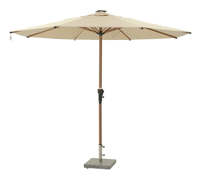 Premium aurinkovarjo Ø300 cm led-valoillaPremium aurinkovarjo yhdistää lämpimän puuilmeen ja helppohoitoiset materiaalit. Runko on alumiinia, jonka tiikkipuuta muistuttava kuviointi tuo pihalle pehmeää ilmettä. Myös varjon kaaret ovat alumiinia, joten rakenne on tukeva mutta kevyt käyttää. Veivattava mekanismi tekee avaamisesta ja sulkemisesta vaivatonta ja 300 cm halkaisija antaa miellyttävän suojan ruokailuryhmälle, sohvaryhmälle tai lepotuoleille.