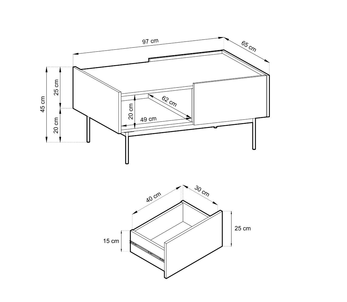 Säilytystilalla varustettu Puuteri sohvapöytä 97x65 cmTuo kotiisi modernia tyylikkyyttä Puuteri-sohvapöydällä, joka hurmaa kauniin linjakkaalla muotoilullaan ja greigen sävyllään. Sohvapöytä tarjoaa käytännöllistä säilytystilaa kahden vetolaatikon avulla, jotka sijaitsevat pöydän molemmin puolin ja liukuvat sujuvasti metalliliukukiskoilla. Lisäksi pöydästä löytyy koko pöydän syvyinen avohylly, joka on täydellinen paikka säilyttää kirjoja, lehtiä tai muita esineitä, jotka haluat pitää käden ulottuvilla.