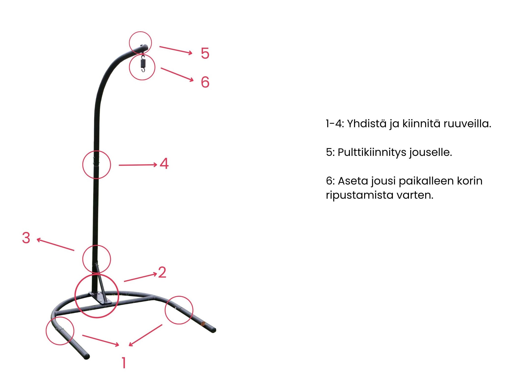 Sisältää riippukeinun telineen, ripustusjousen sekä remmin, jolla keinu voidaan kiinnittää alaosasta runkoon. Ei sisällä keinuosaa eikä ripustuskettinkiä. Teline on sopiva mm. Nietos, String ja Luoto riippukeinuille.